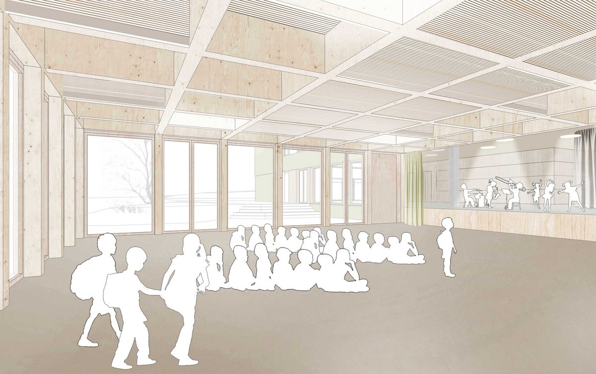 Die sechzügige Schule weist im Erdgeschoss großzügige Flächen für Foyer, Mensa und Musik auf, die durch mobile Wände flexibel nutzbar sind.