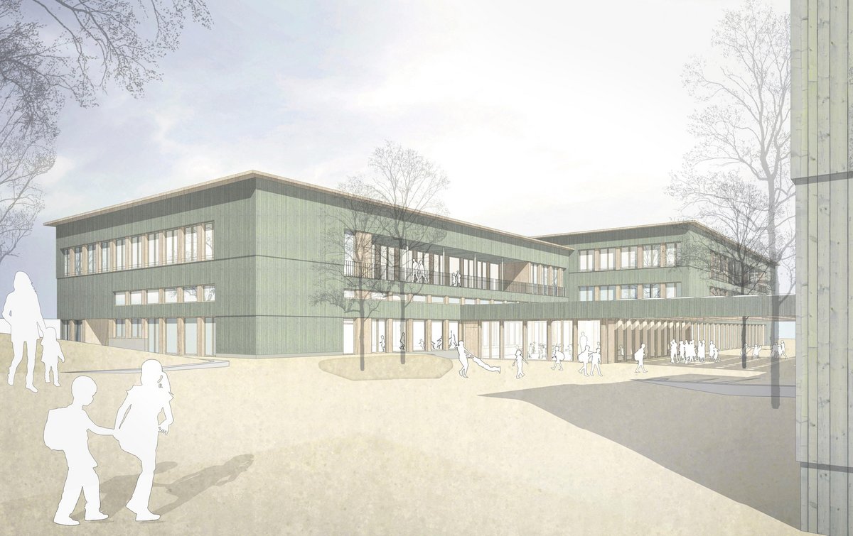 Das Gebäude wird als Clusterschule nach den Maßstäben ressourcenschonenender Bauweise in innovativer Holz-Hybrid-Konstruktion mit Holz-Beton-Verbunddecken errichtet. Der Betonanteil der Decken wird dabei auf das notwendige Mindestmaß reduziert.