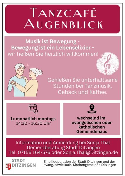 Nähere Informationen bzgl. Unterstützungs-, Entlastungs- und Hilfsmöglichkeiten bei Demenz (Betreuungscafé Augenblick, Tanzcafé Augenblick und Angehörigengesprächskreis) entnehmen Sie bitte dem folgenden Flyer:
