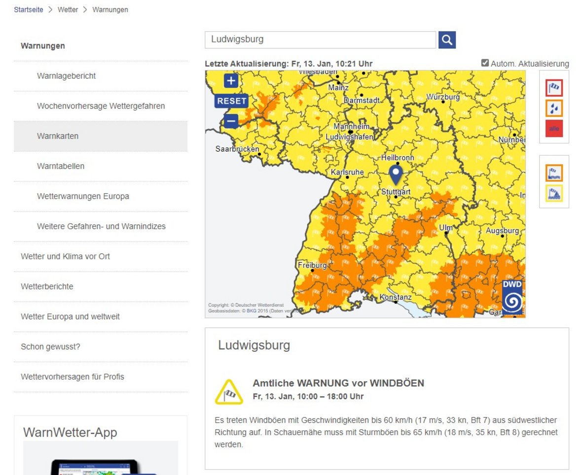 Achten Sie auf die Wettervorhersagen und Unwetterwarnungen in Rundfunk und Fernsehen, in der NINA Warnapp und auf der Seite des DWD. Hochwasser ist in der Regel eine Folge von Wetterereignissen, die sich mit einem gewissen Vorlauf vorhersagen lassen.