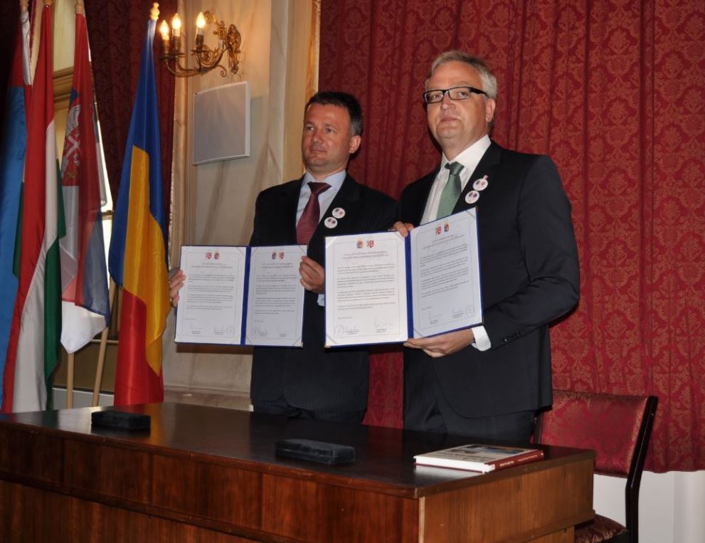 Zum Abschluss des Festaktes unterzeichneten Bürgermeister Dr. Ernö Görgényi und Bürgermeister Ulrich Bahmer die Jubiläumserklärung zwischen den Städten Gyula und Ditzingen.