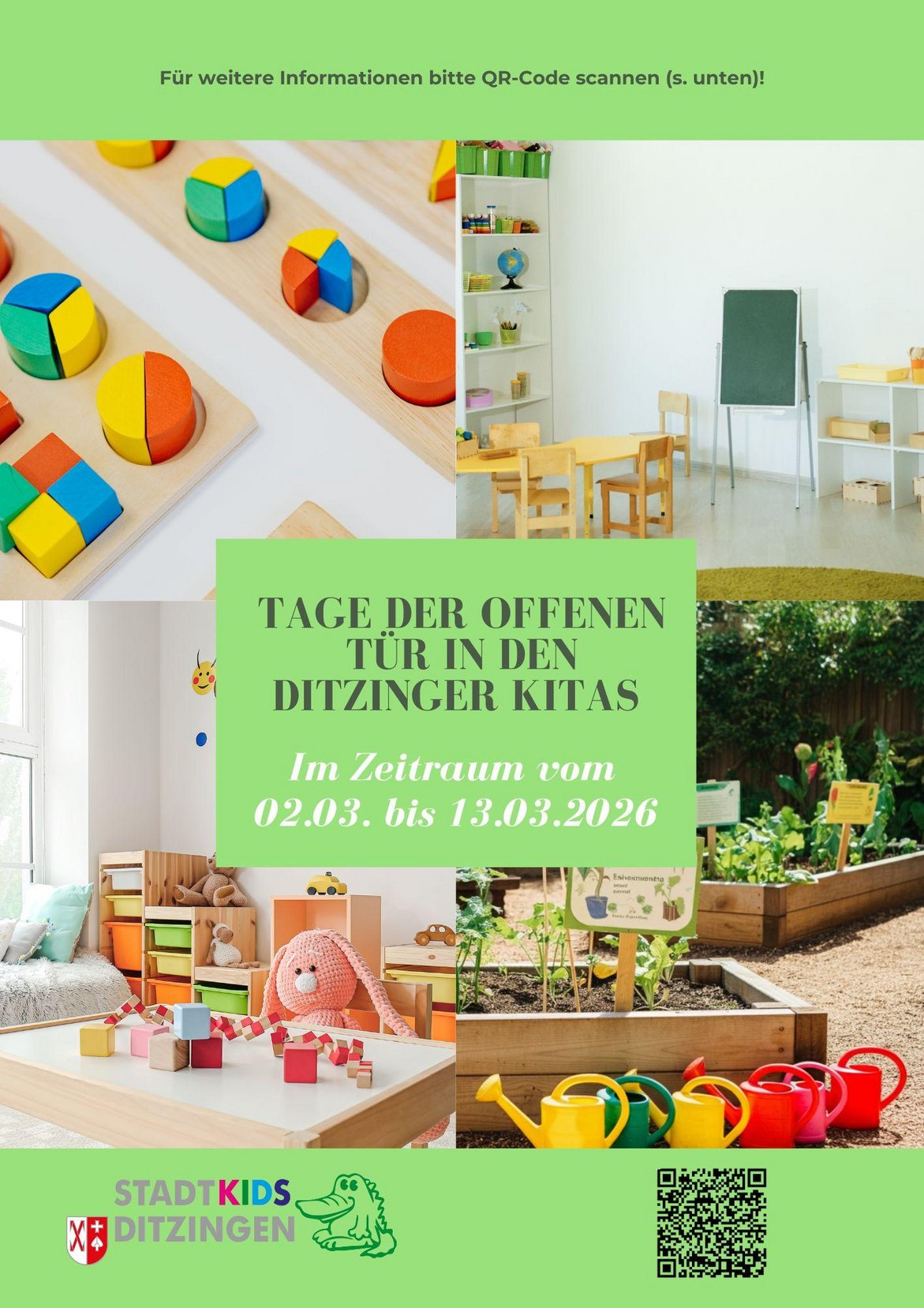 Die Anmeldung der Kinder für das kommende Kindergartenjahr 2026/27 wird bis zum 15.03.2026 erbeten, um eine möglichst frühzeitige Planung sicherzustellen und den Bedarf an Kitaplätzen erfassen zu können. Den Link zum Anmeldeformular finden Sie unter www.kita-ditzingen.de.