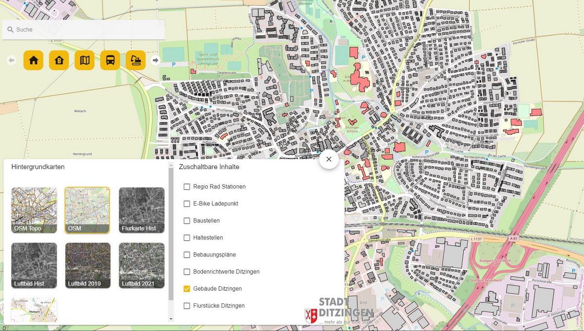 Das GeoPortal der Großen Kreisstadt Ditzingen ist keinesfalls ein abgeschlossenes Projekt. Schrittweise wird das Portal mit weiteren Daten verschiedener Ämter und Abteilungen gefüllt.
