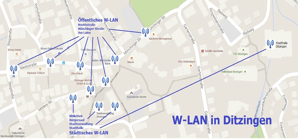 Zunächst ist der zentrale Bereich der Ditzinger Kernstadt mit dem freien Internetzugang versorgt. Das WLAN ist in großen Teilen der Marktstraße sowie im Bereich am Laien zu empfangen und nutzbar.